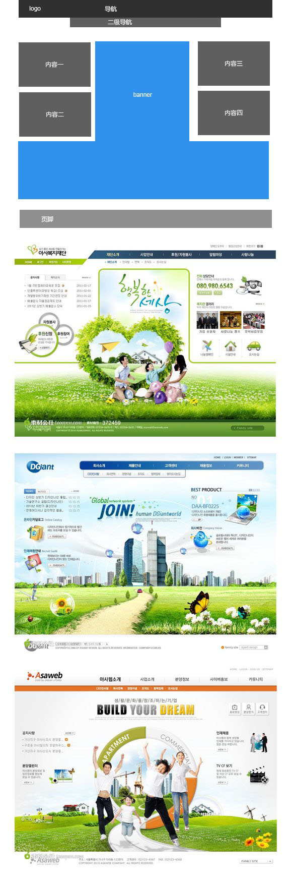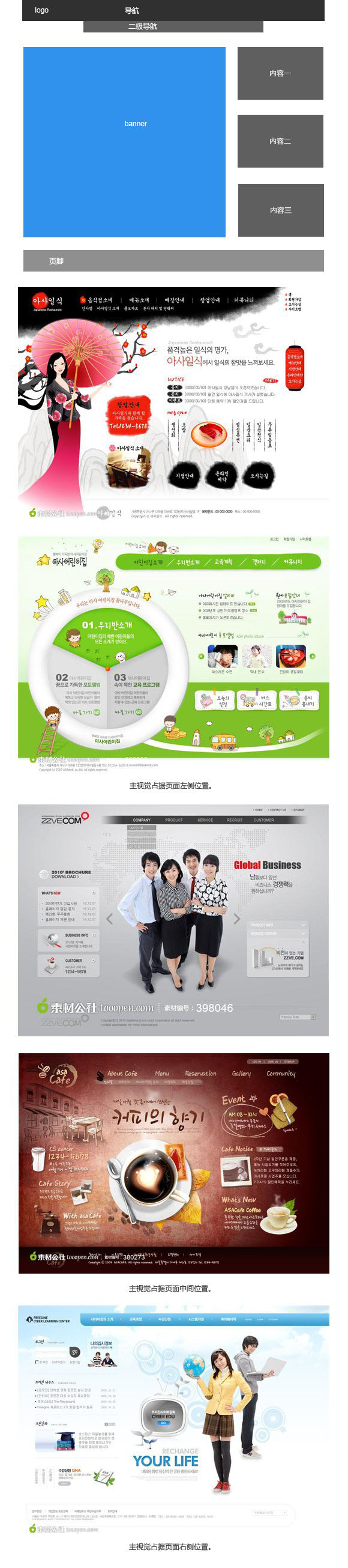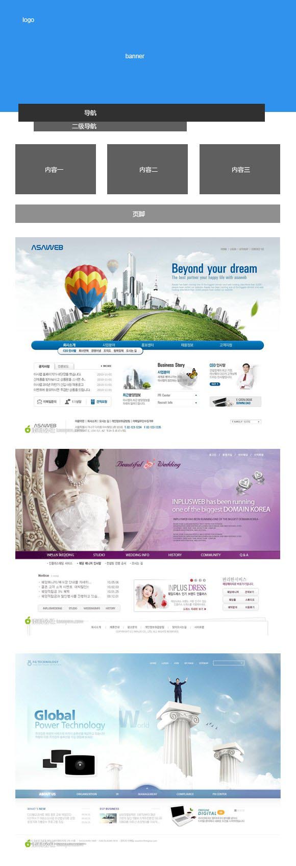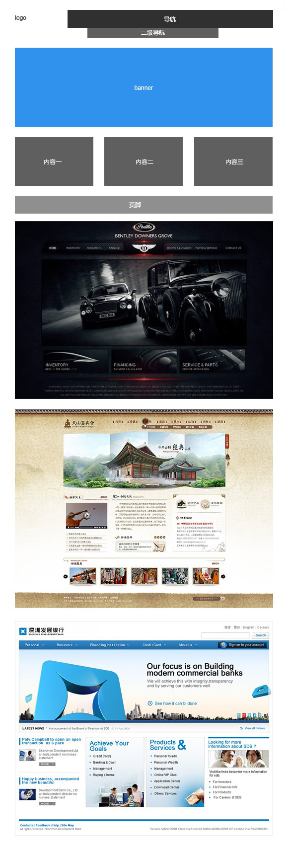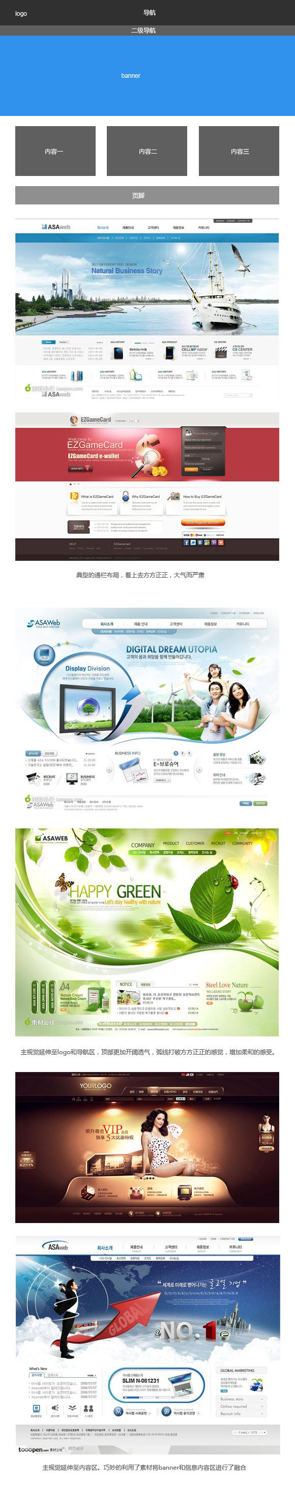 設(shè)計中總是擺脫不了大框套小框的設(shè)計布局思路,不加思索的跳入單一的網(wǎng)頁布局形式中,于是就有了把企業(yè)站常用的頁面布局方式總結(jié)一下的想法,讓大家包括我自己全面的了解一下企業(yè)站的常見布局方式,做到對此種類型的網(wǎng)站布局心中有數(shù),跳出狹隘、單一的設(shè)計思路。很多人常常詢問某個頁面該如何布局這樣的問題,其實網(wǎng)頁布局也沒有想象中那么難,只要做到兩點我認為起碼可以做到臨陣不慌,一是對常見的布局方式心中有數(shù),二是根據(jù)信息內(nèi)容及設(shè)計素材的特點進行擺積木式的多次嘗試?;畈欢嗾f,下面就是我總結(jié)的企業(yè)站首頁常用到的六種網(wǎng)站布局方法。