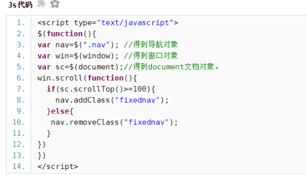 講下這個(gè)js的意思,判斷下拉到一定高度的時(shí)候,給導(dǎo)航欄的div插入一個(gè)”fixednav“屬性,然后給”fixednav“加上固定在頂部的參數(shù)。